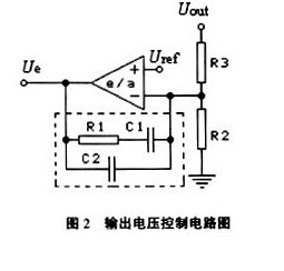 輸出電壓Uout在作為控制取樣信號時,通常經(jīng)過圖2所示的電路進行處理,得到電壓信號Ue,Ue再經(jīng)處理或直接送入PWM控制器。圖2中電壓運算放大器(e/a)的作用有三: