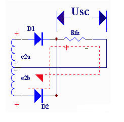 全波整流電路的工作原理,可用圖5-4所示的波形圖說明。在0~π間內(nèi),e2a對Dl為正向電壓,D1導(dǎo)通,在Rfz上得到上正下負(fù)的電壓;e2b對D2為反向電壓,D2不導(dǎo)通(見下圖在π-2π時(shí)間內(nèi),e2b對D2為正向電壓,D2導(dǎo)通,在Rfz上得到的仍然是上正下負(fù)的電壓;e2a對D1為反向電壓,D1不導(dǎo)通(見下圖如此反復(fù),由于兩個整流元件D1、D2輪流導(dǎo)電,結(jié)果負(fù)載電阻Rfz上在正、負(fù)兩個半周作用期間,都有同一方向的電流通過,如圖所示的那樣,因此稱為全波整流,全波整流不僅利用了正半周,而且還巧妙地利用了負(fù)半周,從而大大地提高了整流效率(Usc=0.9e2,比半波整流時(shí)大一倍)。
