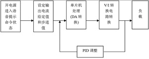 系統(tǒng)軟件設(shè)計在凌陽十六單片機應(yīng)用開發(fā)工具unSPIDE1.16.1中進行,采用凌陽單片機匯編語言和標(biāo)準(zhǔn)C語言對單片機進行編程。主要實現(xiàn)5個功能:(1)系統(tǒng)的初始化,包括各外圍接口設(shè)備的初始化;(2)鍵盤輸入;(3)D/A、A/D轉(zhuǎn)換;(4)PID算法進行電流調(diào)整;(5)語音提示和電流顯示。其主程序流程圖如圖5所示。