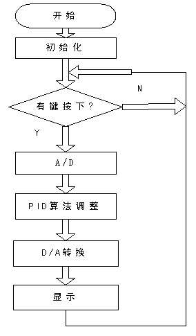 在工作過程中,SPCE061A單片機將被預(yù)置的電流值通過換算進行D/A轉(zhuǎn)換,以輸出電壓驅(qū)動V/I轉(zhuǎn)換電路實現(xiàn)電路輸出,并將該電流值對應(yīng)的電壓值通過閉環(huán)回路,經(jīng)A/D轉(zhuǎn)換后輸入單片機系統(tǒng),再通過PID算法調(diào)整電流輸出。整個系統(tǒng)工作流程圖如圖4所示。