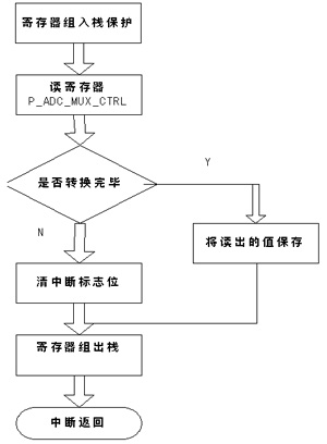 A/D轉(zhuǎn)換部分程序主要用于將采樣電阻采到的模擬電壓信號轉(zhuǎn)換為數(shù)字信號。采樣信號由IoA6輸入并直接送入緩沖器P_ADC_MUX_Data,在ADC自動方式被啟用后,會產(chǎn)生一個啟動信號,此時,RDY=0,DAC0的電壓模擬量與外部的采樣模擬比較,以盡快找出外部信號模擬量的數(shù)字量,A/D轉(zhuǎn)換的結(jié)果保存在SAR內(nèi)。當(dāng)10位A/D轉(zhuǎn)換完成時,RDY=1,此時,通過讀P_ADC_MUX_Data單元可以獲得10位A/D轉(zhuǎn)換的數(shù)據(jù)。其IRQ1中斷服務(wù)程序的流程圖如圖6所示。