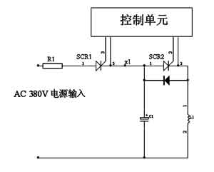 控制原理是:首先通過380V交流電給C1充電,正半周SCR1導(dǎo)通,完成充電過程,負(fù)半周SCR1自動截止,C1電壓一直保持到下一個正半周期信號到來。此時(shí)開通SCR2,使C1、L1形成回路,產(chǎn)生自由震蕩并完成放電。如此反復(fù)循環(huán),即達(dá)到了理想的磁場波形。