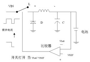 快速調(diào)節(jié)器的操作是通過(guò)控制一個(gè)晶體管開關(guān)的占空比來(lái)實(shí)現(xiàn)的。占空比會(huì)自動(dòng)增加以使電池流入更多的電流。當(dāng)VBATT<VREF時(shí),一個(gè)比較器會(huì)將開關(guān)閉合(參見圖5a),電流流入電池和電容C,這個(gè)電流同時(shí)也存儲(chǔ)在電感L中。VBATT持續(xù)升高,直到超過(guò)VREF,調(diào)節(jié)此時(shí)比較器將開關(guān)斷開(參見圖5b),存儲(chǔ)在電感中的電流迅速下降直到二極管偏置,使得電感電流以減速度流入電池,電容C在電感電流衰減后開始放電。并且最后VBATT開始下降,當(dāng)VBATT低于VREF時(shí),比較器再次將開關(guān)閉合并開始另一次循環(huán)。在較大的范圍內(nèi)如果減小占空縮短閉合的時(shí)間,平均電壓就會(huì)下降,反之亦然。因此可以通過(guò)控制占空比的方法調(diào)節(jié)電壓或電流至所需要的值。