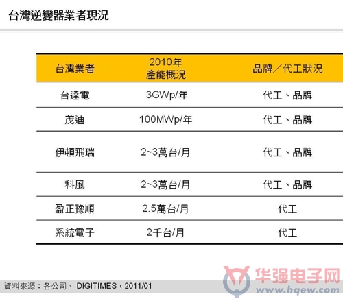DIGITIMES Research指出,目前臺(tái)廠逆變器均獲得多數(shù)國(guó)家并網(wǎng)認(rèn)證,產(chǎn)品品質(zhì)有相當(dāng)水準(zhǔn)。然而,太陽能逆變器的缺貨狀況在2010年第3季告一段落,因此,2010年第4季兩岸業(yè)者的出貨量明顯下滑。當(dāng)全球知名太陽能逆變器業(yè)者于2010年以2、3倍甚至更高的速度擴(kuò)充產(chǎn)能,加上上游零組件缺料疑慮解除,太陽能逆變器供給缺口得以補(bǔ)足時(shí),兩岸業(yè)者能否持續(xù)獲得訂單,成為市場(chǎng)一大疑慮。