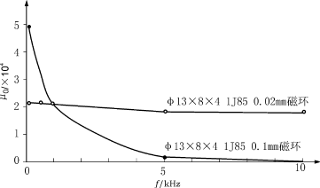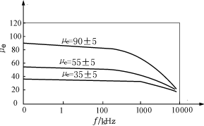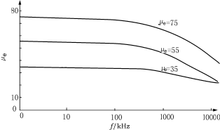 共模電感是完全對稱、線圈匝數(shù)相同的兩個電感線圈,繞在同一個鐵心上,電流同方向流經(jīng)兩組線圈后,根據(jù)右手螺旋法則,在電感鐵心內(nèi)產(chǎn)生兩個方向相反的磁場,由于流經(jīng)電流大小,線圈匝數(shù)完全相同,磁場強度強弱相當,因而完全抵消,不存在磁飽和問題,主要是要考慮電感鐵心材料的初始磁導率μo,對于這類材料的μo越高越好,通常有高μo系列的鐵氧體磁心,μo=4×103,6×103,8×103,1×104等類型,鐵基超微晶材料μo≥5×104,坡莫合金系列如1J79,1J851系列,μo≥5×104。在選擇金屬磁性材料時必須注意頻響問題(見圖3)1J79或1J851系列的磁心μo隨頻率上升而下降的幅度比較大,越薄的材料,μo隨頻率下降的幅度比較小,設(shè)計時應注意這一點。