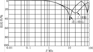 但是值得商榷的是,可選擇作為濾波器的差模電感的磁粉心不僅僅是μe=75鐵粉心一種,圖5是鐵粉心系列μe=75,μe=55,μe=35磁導率隨頻率變化的曲線,可見它們磁導率隨頻率上升而下降的趨勢不同。圖6是MICROMETARS公司-8(μe=35)和上海鋼研精密合金器材研究所SF-33(μe=37.5)鐵粉心材料的插入損耗曲線,可見吸收峰出現(xiàn)在不同的頻率范圍內(nèi),因此除了考慮電感量大小,磁飽和問題,價格等因素外,還應該考慮抑制噪聲的頻率范圍,來選擇不同型號的鐵粉心。