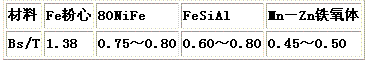 目前扼流圈鐵心使用的材料主要有兩類,一類是功率鐵氧體磁心加開氣隙,另一類是磁粉心。表1是它們的飽和磁感應強度(Bs)的比較,其中錳鋅軟磁鐵氧體Bs值最低,為0.5T,約為鐵粉心的一半左右,因此在同樣安匝數(shù)下和鐵粉心相比截面將增加1倍左右,因而體積勢必增大。