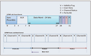 S/PDIF幀格式——首先驅(qū)動(dòng)數(shù)據(jù)的最低有效位。每個(gè)幀有兩個(gè)子幀,分別是32個(gè)時(shí)隙,共64個(gè)時(shí)隙(見(jiàn)圖2)。子幀以一個(gè)前導(dǎo)碼開(kāi)始,后面跟隨24位數(shù)據(jù),最后以攜帶用戶數(shù)據(jù)和通道狀態(tài)等信息的4位結(jié)束。子幀的前4個(gè)時(shí)隙稱為前導(dǎo)碼,用于指示子幀和塊的開(kāi)始。前導(dǎo)碼有三個(gè),每一前導(dǎo)碼均包含一個(gè)或兩個(gè)持續(xù)時(shí)間為3UI的脈沖,從而打破雙相編碼規(guī)則。這意味著,該模式不可能存在于數(shù)據(jù)流中的其他地方。每個(gè)子幀都以4位前導(dǎo)碼開(kāi)始。塊的開(kāi)始用前導(dǎo)碼“Z”和子幀通道的開(kāi)始“A”表示。前導(dǎo)碼“X”表示通道“A”子幀的開(kāi)始(不同于塊的開(kāi)始),前導(dǎo)碼“Y”表示通道“B”子幀的開(kāi)始。