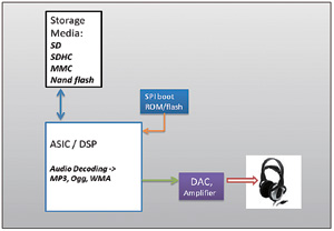 便攜式音頻系統(tǒng)——有些手持式音頻系統(tǒng)采用ASIC,有些則采用DSP。MP3、Ogg和其他媒體文件等音頻內(nèi)容通常存儲(chǔ)在高密度存儲(chǔ)設(shè)備中,如NAND閃存、安全數(shù)字(SD)卡、多媒體卡(MMC)和安全數(shù)字高容量卡(SDHC)等。