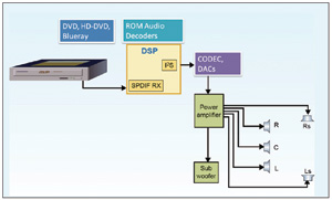 利用多聲道、多揚(yáng)聲器系統(tǒng)和先進(jìn)的音頻算法,音頻系統(tǒng)能夠惟妙惟肖地模擬真實(shí)聲音。這些復(fù)雜的音頻系統(tǒng)使用ASIC或DSP來(lái)解碼多聲道編碼音頻,并且運(yùn)行各種后處理算法。聲道數(shù)量越多,意味著存儲(chǔ)器和帶寬要求越高,這就需要使用音頻數(shù)據(jù)壓縮技術(shù)來(lái)編碼并減少所要存儲(chǔ)的數(shù)據(jù)。這些技術(shù)還能用來(lái)保持聲音質(zhì)量。