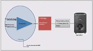 為了解調(diào)PWM并重建原始模擬波形,需要使用由LC(電感+電容)構(gòu)成的高質(zhì)量低通濾波器。由于大多數(shù)音頻系統(tǒng)使用DSP,因此D類放大器對(duì)音頻系統(tǒng)設(shè)計(jì)很有利。音頻信號(hào)可以由DSP本身調(diào)制為PWM,然后直接饋送至D類放大器的輸入端,而無(wú)須使用音頻DAC或編解碼器。因此,除了提高放大器功率效率以外,它還能通過(guò)消除編解碼器/DAC來(lái)降低系統(tǒng)成本。對(duì)于D類放大器設(shè)計(jì)而言,低通重建濾波器是確保良好THD指標(biāo)的最重要因素。