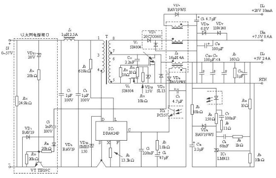 該電源以5V輸出作為主輸出,其他兩路輸出都是在此基礎上獲得的。由C11,R11,R12和MOS場效應管V2及V1構成5V主輸出的電容耦合式同步整流器。穩(wěn)壓管VDZ3起箝位作用。在沒有開關信號時,通過下拉電阻R13使V2關斷。儲能電感L2回掃繞組的電壓經(jīng)過VD4和C9整流濾波后,獲得20V輸出。高頻變壓器次級繞組(8-5)的電壓經(jīng)過VD3和C10整流濾波后獲得7.5V輸出。將6.8V穩(wěn)壓管VDZ4和二極管VD7反極性串聯(lián)后作為7.5V輸出的負載電阻,以改善空載穩(wěn)壓特性。空載時輸出電壓一旦超過7.5V,VDZ4就被反向擊穿,利用VDZ4和VD2上的壓降可將輸出電壓箝制在大約7.5V上。正常工作時,輔助繞組的輸出電壓經(jīng)過VD6、C5整流濾波后給光耦合器PC357提供12~15V的偏壓。R5、VD8和C16組成軟啟動電路,能防止在啟動過程中輸出過沖。