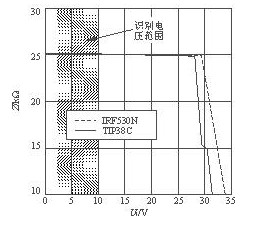 如圖4所示為使用MOSFET(V3)的開關電路。VDZ4及VDZ5分別采用28V及15V穩(wěn)壓管。當輸入電壓超過28V時VDZ4被反向擊穿,使V3導通,將電源開啟。當輸入電壓超過43V時VDZ5也被反向擊穿,能限制V3的柵-源電壓,起到保護作用。R15能防止V3被誤導通。該以太網(wǎng)電源模塊的識別信號阻抗與輸入電壓的關系曲線如圖5所示,識別電壓范圍是2.5~10V。