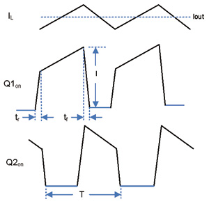 在頻域內(nèi)測量輻射和傳導電磁干擾,這就是對已知波形做傅里葉級數(shù)展開,本文中我們著重考慮輻射電磁干擾性能。在同步降壓轉(zhuǎn)換器中,引起電磁干擾的主要開關波形是由Q1和Q2產(chǎn)生的,也就是每個場效應管在其各自導通周期內(nèi)從漏極到源極的電流di/dt。圖2所示的電流波形(Q1on和Q2on)不是很規(guī)則的梯形,但是我們的操作自由度也就更大,因為導體電流的過渡相對較慢,所以可以應用HenryOtt經(jīng)典著作《電子系統(tǒng)中的噪聲降低技術》中的公式1。我們發(fā)現(xiàn),對于一個類似的波形,其上升和下降時間會直接影響諧波振幅或傅里葉系數(shù)(In)。