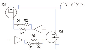 諧波系列的電磁干擾幅度受Q1和Q2的通斷影響。在測量漏源電壓VDS的上升時間tr和下降時間tf,或流經(jīng)Q1和Q2的電流上升率di/dt時,可以很明顯看到這一點。這也表示,我們可以很簡單地通過減緩Q1或Q2的通斷速度來降低電磁干擾水平。事實正是如此,延長開關時間的確對頻率高于f=1/πtr的諧波有很大影響。不過,此時必須在增加散熱和降低損耗間進行折中。盡管如此,對這些參數(shù)加以控制仍是一個好方法,它有助于在電磁干擾和熱性能間取得平衡。具體可以通過增加一個小阻值電阻(通常小于5Ω)實現(xiàn),該電阻與Q1和Q2的柵極串聯(lián)即可控制tr和tf,你也可以給柵極電阻串聯(lián)一個"關斷二極管"來獨立控制過渡時間tr或tf(見圖3)。這其實是一個迭代過程,甚至連經(jīng)驗最豐富的電源設計人員都使用這種方法。我們的最終目標是通過放慢晶體管的通斷速度,使電磁干擾降低至可接受的水平,同時保證其溫度足夠低以確保穩(wěn)定性。