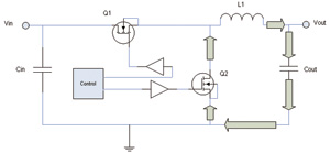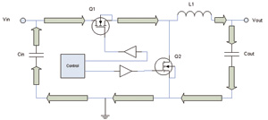 當Q1關斷、Q2導通時,就形成了第二個回路。之后存儲在L1內(nèi)的能量流經(jīng)輸出電容器和Q2,如圖5所示。這些回路面積控制對于降低電磁干擾是很重要的,在PCB走線布線時就要預先考慮清器件的布局問題。當然,回路面積能做到多小也是有實際限制的。