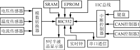系統(tǒng)的主要功能包括數(shù)據(jù)采集、電量估計(jì)及顯示診斷等。由于80C552具有8路10位A/D轉(zhuǎn)換的功能,因此,采集模塊先采用線性光耦法測(cè)量單電池的電壓,通過(guò)其4個(gè)A/D口將模擬量轉(zhuǎn)換為數(shù)字量存入存儲(chǔ)器,溫度測(cè)量采用單總線技術(shù),使用Dallas數(shù)字芯片來(lái)測(cè)量溫度,該芯片具有12位的精度等級(jí),能非常準(zhǔn)確地測(cè)量到系統(tǒng)的溫度??傠妷?、電流信號(hào)通過(guò)特殊的傳感器將其信號(hào)轉(zhuǎn)換為0~10V的信號(hào),通過(guò)14位的A/D轉(zhuǎn)換器件轉(zhuǎn)換為數(shù)字量存入系統(tǒng)。