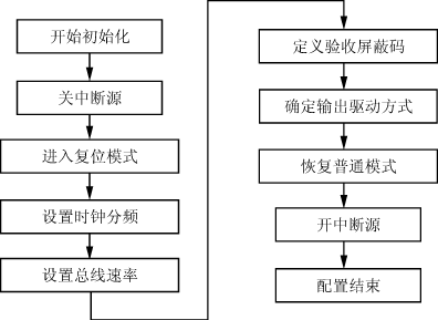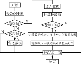SJA1000在上電硬件復(fù)位之后,必須對(duì)其進(jìn)行軟件初始化之后才可以進(jìn)行數(shù)據(jù)通訊,初始化過(guò)程主要包括對(duì)其復(fù)位模式下配置時(shí)鐘分頻寄存器CDR、總線定時(shí)寄存器BTR0和BTR1、驗(yàn)收代碼寄存器ACR、驗(yàn)收屏蔽寄存器AMR及輸出控制寄存器OCR等,實(shí)現(xiàn)對(duì)總線的速率、驗(yàn)收屏蔽碼、輸出引腳驅(qū)動(dòng)方式、總線模式及時(shí)鐘分頻進(jìn)行定義。具體的流程如圖5所示。下面為SJA1000發(fā)送和接收數(shù)據(jù)的流程,基本過(guò)程為主控制器將數(shù)據(jù)保存到SJA1000發(fā)送緩沖器,然后對(duì)命令寄存器的發(fā)送請(qǐng)求TR標(biāo)志位進(jìn)行置位開(kāi)始發(fā)送;接收過(guò)程為SJA1000將從總線上接收到的數(shù)據(jù)存入接收緩沖器,通過(guò)其中斷標(biāo)志位通知主控制器來(lái)處理接收到的信息,接收完畢之后清空緩沖器,等待下次接收,具體的流程如圖6和圖7所示。