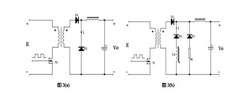 在圖3(a)所示的正激電源電路中,當初級功率管V1開始導通,次級整流二極管D1開始導通,D2開始截止時,由于二極管PN結(jié)的電荷存儲效應(yīng),D2中流過了電流變化率di/dt很大的反向恢復尖峰電流i,致使V1、D1中也有相應(yīng)的尖峰電流流過,在漏感、線電感等因素的共同作用下會在電源輸出端產(chǎn)生高頻的導通噪聲。在D2上施加的反向電壓越大,D2的反向恢復時間越長,反向恢復電流變化率di/dt就越大,電源輸出噪聲也就越大。大的反向恢復尖峰電流,不僅會產(chǎn)生電源噪聲,也容易損壞整流器件。