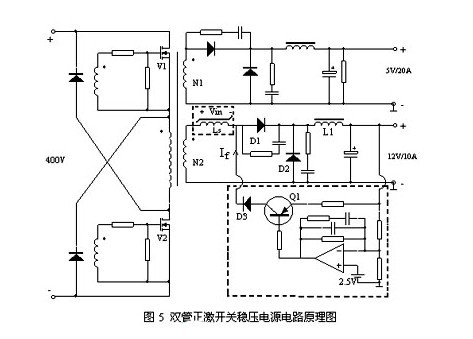磁放大器穩(wěn)壓是利用可飽和電感導通延時的物理特性來控制開關(guān)電源的占空比和輸出功率,穩(wěn)定電源輸出電壓的一種方法。在可飽和電感上加上適當?shù)牟蓸雍涂刂圃?,調(diào)節(jié)其導通延時的時間,就可以構(gòu)成最常見的磁放大器穩(wěn)壓電路。圖5是一個輸入為110Vac~220Vac/50HZ,輸出為5Vdc/20A,12Vdc/10A的雙管正激開關(guān)穩(wěn)壓電源,其中5V是主控回路。其輔路12V輸出電流較大,對穩(wěn)壓精度和負載穩(wěn)定度都有較高要求,采用普通的方法穩(wěn)壓效果都不是很理想,如果采用磁放大器穩(wěn)壓技術(shù)就可圓滿解決這一問題,使穩(wěn)壓電路的結(jié)構(gòu)簡單,耗散功率小,并可達到毫伏級的穩(wěn)壓精度。