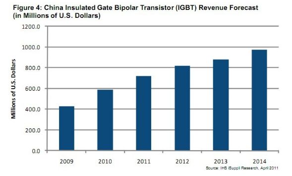 據(jù)IHS iSuppli公司的研究,由于工業(yè)與消費(fèi)領(lǐng)域的需求增長(zhǎng),中國(guó)絕緣柵雙極型晶體管(IGBT)市場(chǎng)未來(lái)幾年將快速增長(zhǎng),2014年銷(xiāo)售額將從2009年的4.297億美元上升到9.75億美元,增長(zhǎng)一倍以上。
