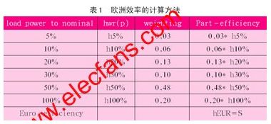 因此為了提高光伏逆變器的歐洲效率,僅僅降低額定負(fù)載時(shí)的損耗是不夠的,必須同時(shí)提高不同負(fù)載情況下的效率。歐洲效率是一個(gè)新的參數(shù),主要是針對(duì)光伏逆變器提出來的。由于太陽光在不同時(shí)間,強(qiáng)度是不一樣的,所以光伏逆變器其實(shí)并不會(huì)一直工作在額定功率下,更多的是工作在輕負(fù)載的時(shí)候。所以衡量光伏逆變器的效率,不能完全以額定功率下的效率來衡量。所以歐洲人就想出來了一個(gè)新的參數(shù)–歐洲效率來衡量。歐洲效率的計(jì)算方法如表1。