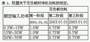 在環(huán)保意識日益受到重視的綠色時代,有效利用有限的能源已經(jīng)成為人們的共識。歐美國家對于電器產(chǎn)品在空載待機時的功耗定義了明確的規(guī)范,歐盟(EEC)公布的具體規(guī)定如表1所示,而在美國方面,從2001年7月起該國就規(guī)定政府機構不得購買待機功耗超過1W的電器產(chǎn)品。由此可見,在不久的未來,電源轉換器低待機功耗將成為基本要求,這也是電源設計工程師必須面臨的挑戰(zhàn)。
