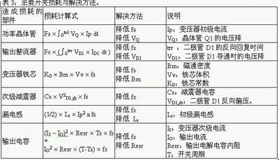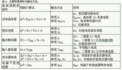 開關電源的損耗包含導通損耗、開關損耗以及外圍控制電路損耗,電路不同部分的損耗成因各不相同,因此抑制損耗的方法也有不同。需要用數(shù)學方程式量化這些損耗,進而整理出降低各部分損耗的方法,才能得出具體有效降低整體損耗的方案。為了討論方便,本文以常用的回掃轉換器為例,將各部分損耗以數(shù)學方程式表示,并列出解決方法。表2、表3及表4分別為導通損耗、切換損耗以及外圍控制電路損耗的原因分析與解決對策。