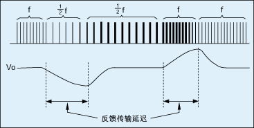 當負載降低到一定程度時,脈沖跳躍機制將使有效開關頻率減半,這意味著轉換器供應負載的功率減半,因此回掃電路將增加脈沖寬度以補足輸出負載所需要的功率,而在脈沖寬度增加到負載所需功率之前,輸出電壓將產(chǎn)生突降。相反的情形發(fā)生在等效開關頻率增加時,輸出電壓將發(fā)生突升。這種負載變動時輸出電壓突升與突降是開關頻率非連續(xù)變動(以整數(shù)倍增加或降低)的必然結果。