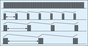 突變模式技術又稱打嗝模式(hiccupmode)或周期省略模式(圖3)。在負載很大情況下,回掃電路根據(jù)輸出電壓變化來調制脈沖寬度。當負載降低到一定程度時,控制電路將維持原有脈沖寬度,轉而周期性跳過部分脈沖,控制電路通過降低總脈沖寬度或增加遮蔽周期長度達到降低損耗的目的。該技術有兩個明顯的缺點,即低頻干擾會和遮蔽周期一起出現(xiàn),而且負載突然改變也會造成輸出電壓突降。