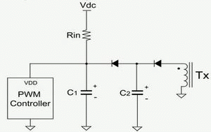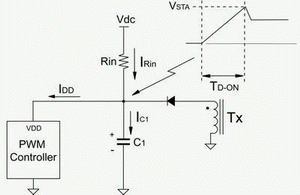 起動電路損耗在電源轉換器空載待機損耗中占很高的比例,此處我們介紹一種起動速度快且損耗低的起動電路。圖6(a)為傳統(tǒng)起動電路,其中VSTA是脈寬調制控制器起始臨界電壓,TD_ON是啟動延遲時間,TD_ON=(C1×VSTA)/IC1。使用較大輸入電阻(Rin)可以有效降低電阻損耗,但啟動延遲時間會延長。因此建議采用圖6(b)電路,其中C1電容較小,這樣在用大輸入電阻時能夠降低起動電路的損耗,同時仍然擁有較快起動速度。較大的C2電容可提供穩(wěn)定的電壓給控制器使用,不會增加起動延遲時間。