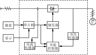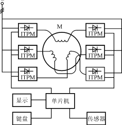 較為完整的ITPM一般由電力晶閘管,移相觸發(fā)器,軟件控制的單片機(jī),電流、電壓、溫度傳感器以及操作鍵盤,LED或LCD顯示等部分組成。如圖1所示。