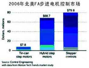 步進運動市場的總體規(guī)模,包括商業(yè)和汽車行業(yè)是相當大的。據(jù)motiontechtrends(mtt)最新的市場研究,核心工業(yè)部門,工廠自動化(fa),代表了一個相對小的但是穩(wěn)固的市場,2006年在北美,步進電機和控制消費大約為156萬美元。fa市場包括機床,機器人系統(tǒng),各種oem的生產(chǎn)機器(包括半導體設備、印刷、紡織、塑膠等)。據(jù)mtt粗略估計,歐洲和日本分別占步進電機市場的15%和50%,高于美國。