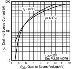 在MOSFET的數(shù)據(jù)表中,通??梢哉业剿牡湫偷膫鬏斕匦?。注意到25℃和175℃兩條曲線有一個(gè)交點(diǎn),此交點(diǎn)對(duì)應(yīng)著相應(yīng)的VGS電壓和ID電流值。若稱這個(gè)交點(diǎn)的VGS為轉(zhuǎn)折電壓,可以看到:在VGS轉(zhuǎn)折電壓的左下部分曲線,VGS電壓一定時(shí),溫度越高,所流過的電流越大,溫度和電流形成正反饋,即MOSFET的RDS(ON)為負(fù)溫度系數(shù),可以將這個(gè)區(qū)域稱為RDS(ON)的負(fù)溫度系數(shù)區(qū)域。