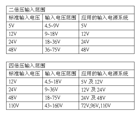 在選用電源模塊輸入電壓范圍時,視輸入電壓變動范圍,業(yè)界有二倍壓輸入及四倍壓輸入可選擇,電壓范圍如下: