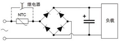浪涌電流的抑制方法有很多,一般中小功率電源中采用電阻限流的辦法抑制開機(jī)浪涌電流。圖2是一個(gè)常見的110V/220V雙輸入電源示意圖,以此為例,我們分析一下如何使用NTC熱敏電阻進(jìn)行浪涌電流的抑制。