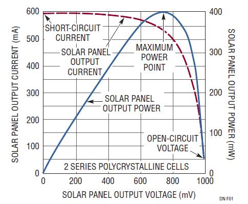 雖然太陽能電池或太陽能電池板是按照功率輸出來分類,但電池板的可用功率卻很少是恒定的。其輸出功率在很大程度上取決于光照、溫度以及從電池板吸收的負(fù)載電流。為說明這一點(diǎn),圖 1 示出了一塊雙電池太陽能板在恒定光照條件下的 V-I 特性曲線。I-V 曲線在短路 (最左側(cè)) 至大約 550mA 負(fù)載電流的范圍內(nèi)具有相對(duì)恒定的電流特性,隨之在較低的電流條件下它遵從于恒定電壓特性,并在開路時(shí) (最右側(cè)) 趨近于最大電壓。電池板的功率輸出曲線顯示:功率輸出在大約 750mV/530mA 的地方 (I-V 曲線的拐點(diǎn)處) 出現(xiàn)一個(gè)明顯的峰值。如果負(fù)載電流增至超過功率峰值,則功率曲線迅速下降至零 (最左側(cè))。同樣,輕負(fù)載也會(huì)使功率趨向于零 (最右側(cè)),不過這往往不太會(huì)是一個(gè)問題。