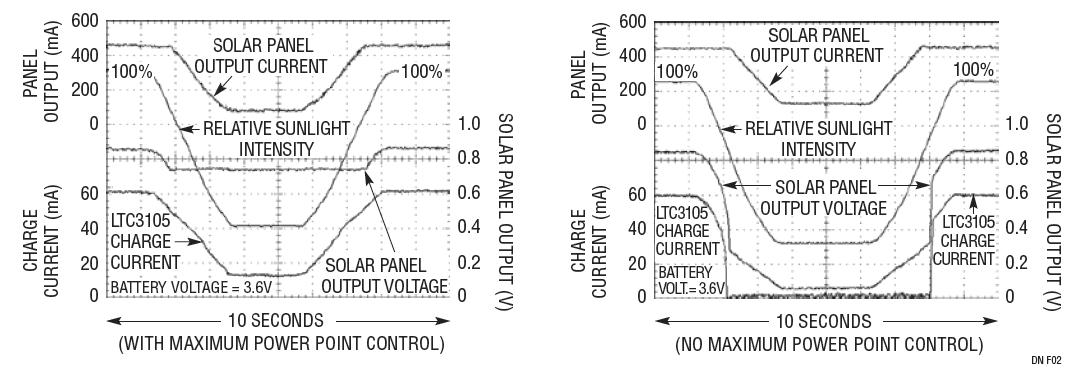 圖 2 示出了在采用和未采用最大功率點(diǎn)控制的情況下,陽光的變化對(duì)于充電電流的影響。模擬陽光的強(qiáng)度從 100% 降至約 20%,而后回升至 100%。請(qǐng)注意,當(dāng)陽光強(qiáng)度下降至 20% 左右時(shí),太陽能板的輸出電壓和電流也下降,但是 LTC®3105 的最大功率點(diǎn)控制則可以防止太陽能板的輸出電壓降至 750mV 的設(shè)定值以下。它通過減小 LTC3105 的輸出充電電流以防止太陽能板電壓驟降至接近 0V 來實(shí)現(xiàn)上述功能,如圖 2 中右側(cè)的曲線圖所示。而在未采用功率點(diǎn)控制時(shí),陽光強(qiáng)度的小幅下降也會(huì)完全阻斷充電電流的流動(dòng)。