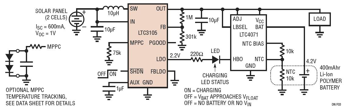 雖然本文描述的電路僅可產(chǎn)生幾百 mW 的功率,但它卻能夠在大多數(shù)天氣條件下提供足以使一個(gè) 400mAhr 鋰離子電池保持滿充電狀態(tài)的功率。低輸入電壓與輸入功率控制相結(jié)合,使得 LTC3105 成為低功率太陽能應(yīng)用的理想選擇。此外,LTC4071 并聯(lián)充電系統(tǒng)還通過提供精準(zhǔn)浮置電壓、充電狀態(tài)和溫度安全特性而對(duì) LTC3105 給予了補(bǔ)充,可在室外環(huán)境中確保長(zhǎng)久的電池使用壽命。