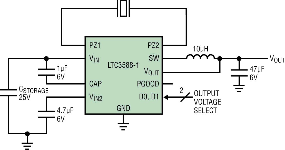 LTC3588-1 是一款完整的能量收集解決方案,專(zhuān)為包括壓電式換能器在內(nèi)的低能量源而優(yōu)化。壓電器件通過(guò)器件的擠壓或撓曲產(chǎn)生能量。視其尺寸和構(gòu)造的不同,這些壓電元件能產(chǎn)生幾百 μW/cm2 的功率。