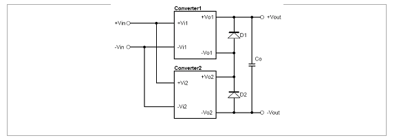 圖3-2為使用Decoupling Diode方式的輸出并聯(lián)應(yīng)用方式,其方式為在二組電源模塊的輸出端,分別串接上二極管,再并聯(lián)使用。