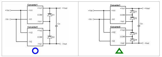 圖2-2為兩個雙路輸出電源模塊串聯(lián)接線方式,因此,可得到四組Vout相加后的輸出電壓。單一個雙路輸出電源模塊,其兩組輸出之啟動時間是一致的,故僅需在+/-Vo1及+/-Vo2各并上二極管即可,如圖左所示。在上圖中,輸出端共并上4顆二極管,此方式亦可行,但較浪費成本。串聯(lián)后的輸出電壓,可再加上輸出電容,用以降低因兩電源模塊差頻所造成的Ripple & Noise。