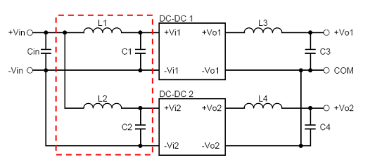 在一電源系統(tǒng)中,若同時使用多組電源模塊,且輸入端使用同一電源時,為防止二組或多組電源模塊之間的交互干擾,形成系統(tǒng)所不樂見的EMI問題,甚至造成系統(tǒng)誤動作的諧波,此時,可在電源系統(tǒng)前端與EMI filter之間加入L1、C1、L2與C2來減低電源模塊之間的交互干擾。