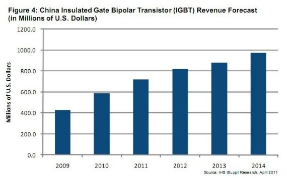 隨著中國(guó)高鐵、地鐵、動(dòng)車、風(fēng)力發(fā)電、光伏發(fā)電、電動(dòng)/混合動(dòng)力汽車等領(lǐng)域的快速發(fā)展,市場(chǎng)對(duì)IGBT及其模塊的需求越來(lái)越大。據(jù)IHS iSuppli公司的研究,由于工業(yè)與消費(fèi)領(lǐng)域的需求增長(zhǎng),中國(guó)絕緣柵雙極型晶體管(IGBT)市場(chǎng)未來(lái)幾年將快速增長(zhǎng),2014年銷售額將從2009年的4.297億美元上升到9.75億美元,增長(zhǎng)一倍以上。