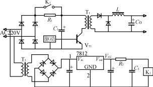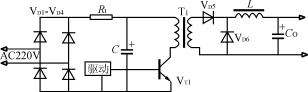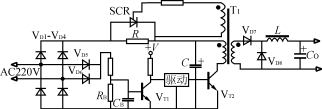 該電路如圖3所示。在電源瞬時(shí)接通時(shí),輸入電壓經(jīng)整流橋VD1VD4和限流電阻R對(duì)電容器C充電。當(dāng)電容器C充電到約80%的額定電壓時(shí),逆變器正常工作,經(jīng)主變壓器輔助繞組產(chǎn)生晶閘管的觸發(fā)信號(hào),使晶閘管導(dǎo)通并短路限流電阻R,開(kāi)關(guān)電源處于正常運(yùn)行狀態(tài)。
