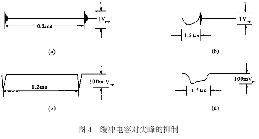 在開關(guān)三極管的CE之間,或者在續(xù)流二極管的兩端并聯(lián)RC緩沖電路可使尖峰干擾明顯減小。圖3中,三極管T關(guān)斷時(shí),集電極電壓上升,通過D和R1對(duì)C充電,使其上升速率變緩,選擇充電常數(shù)CR1的值可以控制上升速率。T導(dǎo)通時(shí),D截止,C對(duì)R1和R2放電,限制了導(dǎo)通瞬間的峰值電流。該緩沖電路改變了負(fù)載線的形狀,減少了開關(guān)三極管的損耗。在續(xù)流二極管兩端并上RC電路也同樣有效。圖3中,當(dāng)用3DD11和2CK120C時(shí),可并0.022LF左右的電容器(f=2kHz),該電容的容量有一最佳值,它的作用可以從圖4看出。圖4(a)是不加C的情況,將其在時(shí)間軸上放大后為圖4(b)。并上緩沖電容后分別見圖4(c)和(d)。
