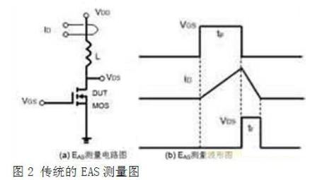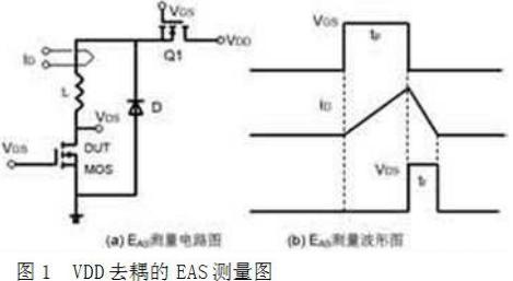 過(guò)去,傳統(tǒng)的測(cè)量EAS的電路圖和波形如圖2所示。注意到,VDS最后的電壓沒有降到0,而是VDD,也就是有部分的能量沒有轉(zhuǎn)換到雪崩能量中。