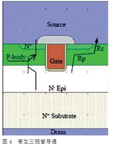 寄生三極管導(dǎo)通損壞:在MOSFET內(nèi)部,有一個(gè)寄生的三極管(見圖4),通常三級(jí)管的擊穿電壓通常低于MOSFET的電壓。當(dāng)DS的反向電流開始流過(guò)P區(qū)后,Rp和Rc產(chǎn)生壓降,Rp和Rc的壓降等于三極管BJT的VBEon。由于局部單元的不一致,那些弱的單元,由于基級(jí)電流IB增加和三級(jí)管的放大作用促使局部的三極管BJT導(dǎo)通,從而導(dǎo)致失控發(fā)生。此時(shí),柵極的電壓不再能夠關(guān)斷MOSFET。
