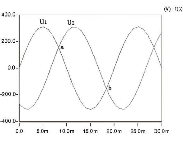 三相電源在自然換相點(diǎn)處,兩相電壓相等,并且是電壓反相的起始點(diǎn),該設(shè)計(jì)正是利用這一特點(diǎn)實(shí)現(xiàn)對自然換相點(diǎn)的檢測,如圖1所示。