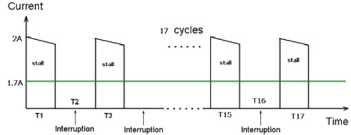 圖6為多功能豆?jié){機的堵轉(zhuǎn)電流。在榨水果的堵轉(zhuǎn)情況下,實測馬達的堵轉(zhuǎn)最大電流為2A,由于榨果汁時馬達也不是一直連續(xù)工作的,也是間隔一定時間工作,間隔時間是馬達工作6S,停3S,這樣換算成在一個榨水果完整工作周期內(nèi)平均電流是1.6~1.7A。在1.6~1.7A堵轉(zhuǎn)電流下,馬達堵轉(zhuǎn)需要保護的時間要求在150S內(nèi)。